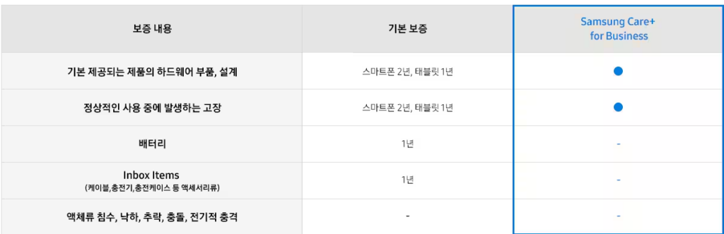 삼성 휴대폰의 기본 보증 기간은 일반적으로 구매일로부터 2년 입니다. 이 기간 동안 기기 자체의 하드웨어와 제조상의 결함에 대해서는 무상 수리가 제공됩니다. 또한 삼성 케어+ 가입 기본 품질 보증 기간 포함 무상수리보증 기간을 최대 3년까지 연장할 수 있어 업무용 모바일 기기의 비즈니스 연속성을 극대화 할 수 있습니다.