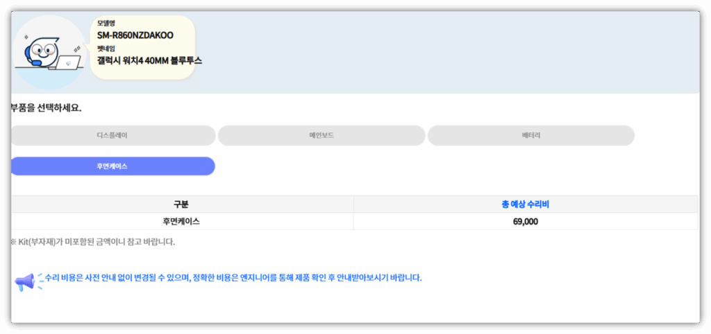 삼성 서비스센터에 공시되어 있는 갤럭시 워치4 정품 케이스 교체 비용은 아래와 같습니다.