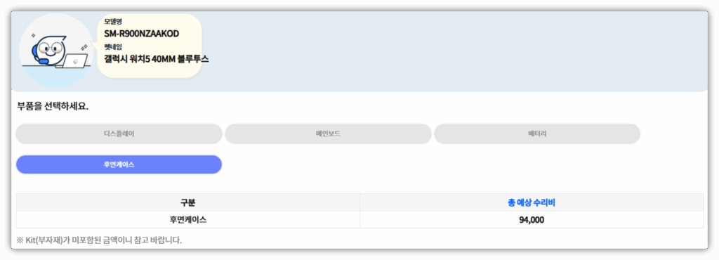 삼성 서비스센터에 공시되어 있는 갤럭시 워치5 정품 케이스 교체 비용은 아래와 같습니다.