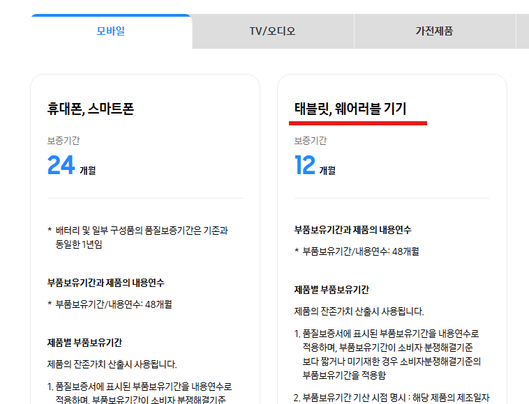 단, 보증기간은 구입 영수증 또는 제품 보증서를 기준으로 확인되기 때문에, 온라인 쇼핑몰이나 통신사 대리점에서 구매했다면 구매 내역을 꼭 보관해 두는 것이 좋습니다.