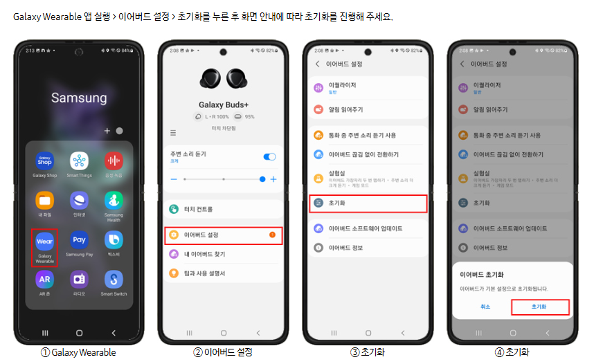 • 그래도 빨간불이 꺼지지 않으면 스마트폰에서 갤럭시 웨어러블 앱을 통해 초기화(리셋)를 시도해보세요.