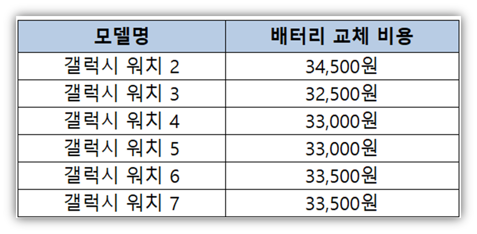 삼성 서비스센터에 공시되어 있는 갤럭시 워치 정품 배터리 교체 비용은 아래와 같습니다.