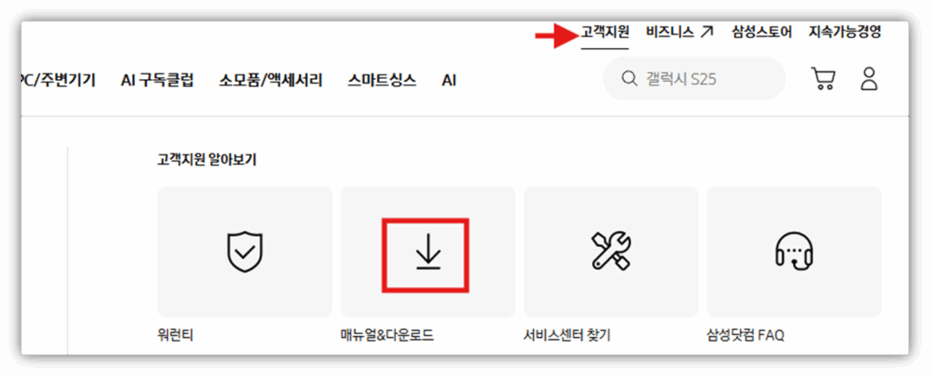 2. 우측 상단 고객지원에 매뉴얼 다운로드 클릭