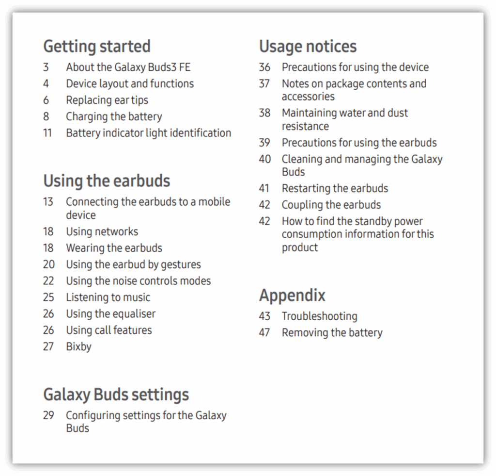 제품을 올바르게 사용하고 문제 상황을 빠르게 해결하기 위해서는 공식 사용 설명서를 확인하는 것이 가장 확실한 방법입니다. 이어폰의 성능을 100% 활용하기 위해 매뉴얼을 꼭 참고하시길 권장드립니다. 앞으로도 버즈3 FE를 보다 편리하고 오래 사용할 수 있도록 꾸준히 관리하시길 바랍니다. 감사합니다.