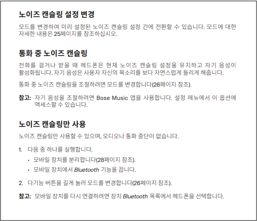 보스 헤드셋의 액티브 노이즈 캔슬링(ANC) 기능은 외부 소음을 제거하기 위해 지속적으로 작동하며, 많은 전력을 소비합니다. 최고 단계로 설정할 경우 배터리 소모가 더욱 빠릅니다.