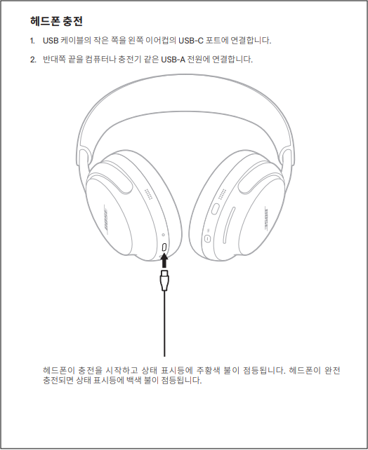 ① 보스에서 권장하는 정품 충전기 또는 인증된 USB-C 케이블과 충전기를 사용하세요.