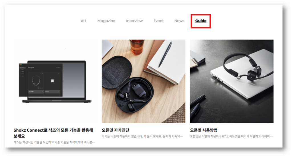 1. 하단 링크 샥즈 공식홈페이지 고객지원 페이지에 접속해 Guide를 클릭합니다.