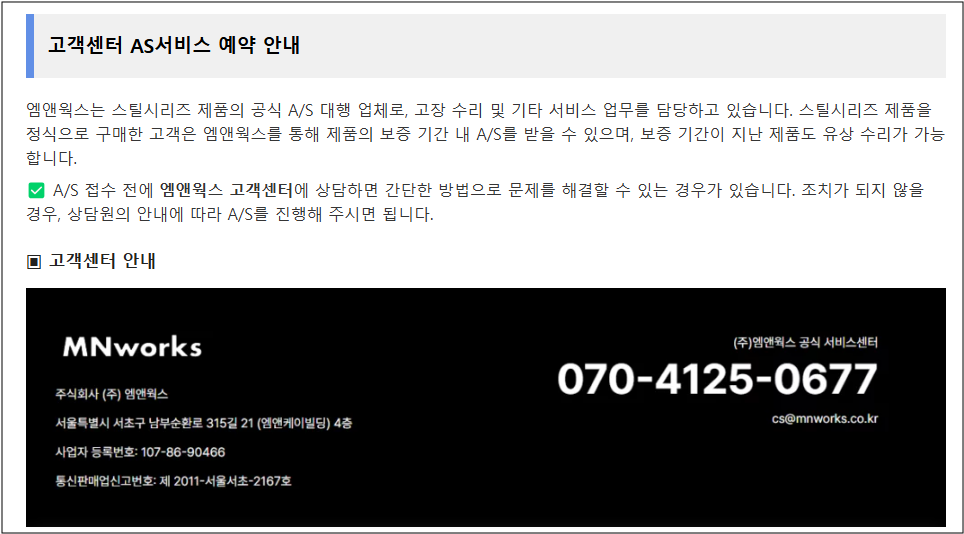 엠앤웍스는 스틸시리즈 제품의 공식 A/S 대행 업체로, 고장 수리 및 기타 서비스 업무를 담당하고 있습니다. 스틸시리즈 제품을 정식으로 구매한 고객은 엠앤웍스를 통해 제품의 보증 기간 내 A/S를 받을 수 있으며, 보증 기간이 지난 제품도 유상 수리가 가능합니다.