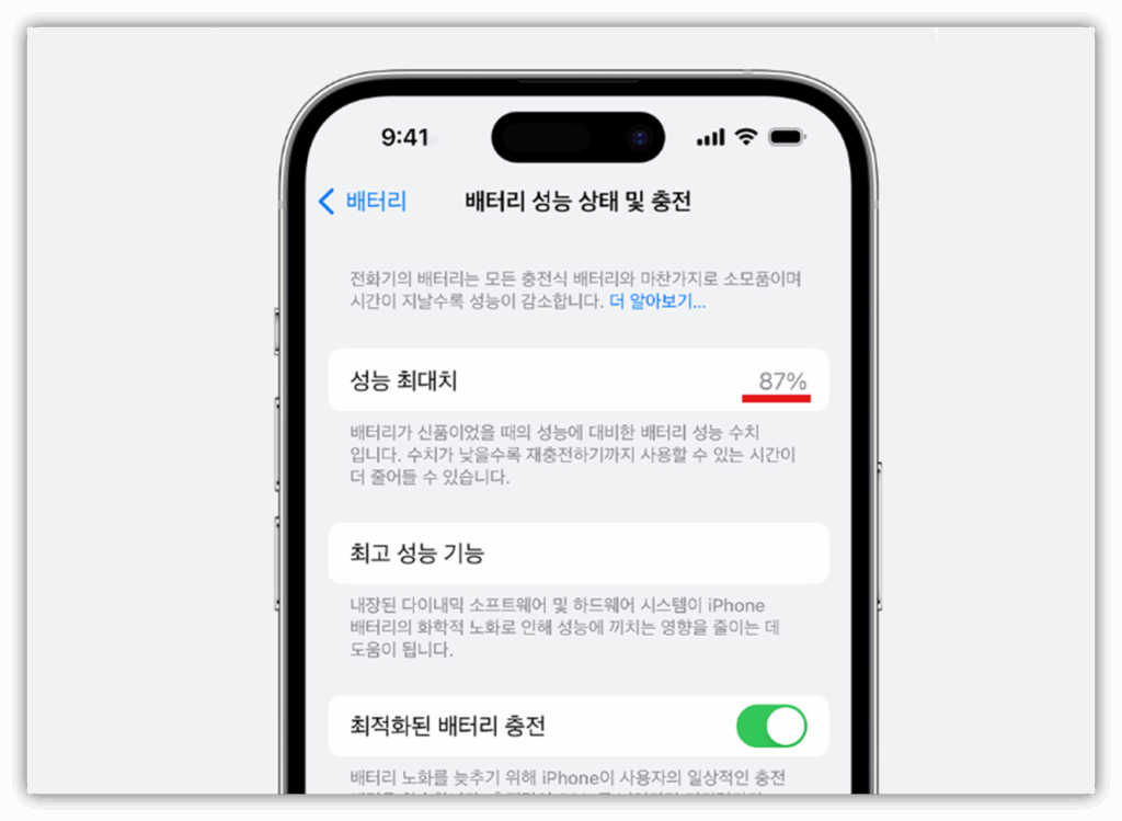 아이폰은 설정 → 배터리 → 배터리 성능 상태에서 최대 성능 기능이 제한되었다는 메시지가 뜨거나, 배터리 최대 용량이 80% 이하로 떨어졌을 때 교체를 권장합니다. 또한 다음과 같은 증상이 나타날 경우 교체 시점을 고려해볼 수 있습니다.