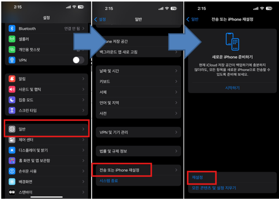 - 경로: 설정 → 일반 → 전송 또는 아이폰 재설정 → 재설정