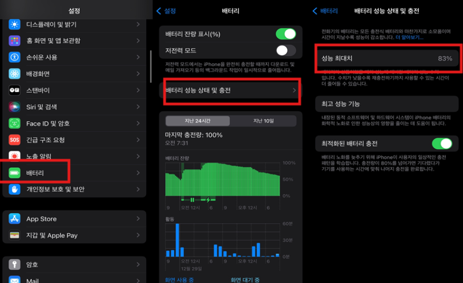 - 설정 → 배터리 → 배터리 성능 상태에서 최대 용량을 확인하세요.