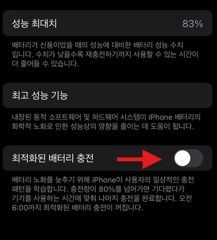 - 설정 → 배터리 → 배터리 성능 상태에서 최적화된 배터리 충전을 비활성화하세요.