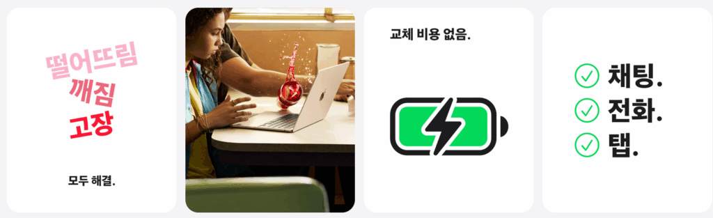 또한, 애플케어플러스(AppleCare+)에 가입하면 보증기간이 연장되고, 파손 수리 비용이 크게 절감됩니다.