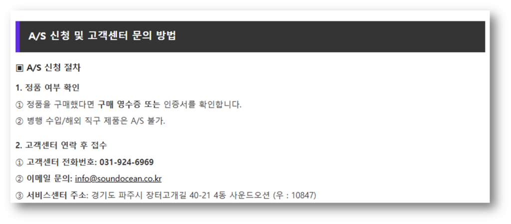 정식 수입품이 아닌 경우, 삼아사운드(유) 및 사운드오션에서 제공하는 A/S 혜택을 받을 수 없습니다.