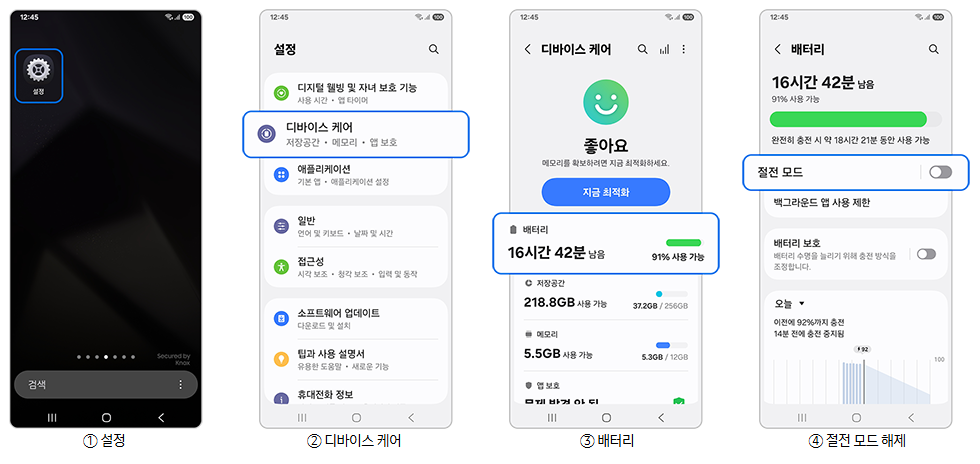 • 설정 > 배터리 및 디바이스 케어 > 배터리 > 더보기 > 배터리 보호