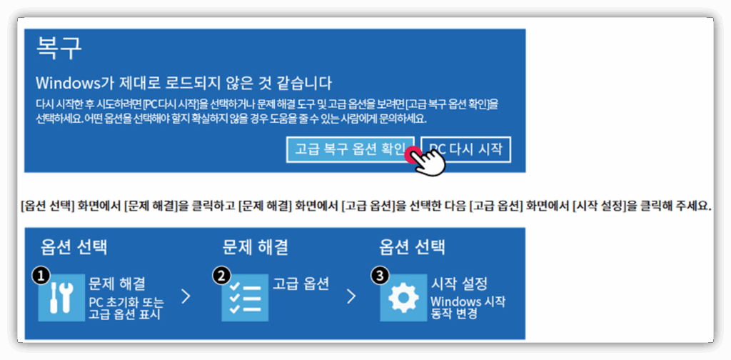 최근 업데이트 이후 전원이 안 켜지는 현상이 발생했다면, BIOS 설정 오류나 펌웨어 충돌일 수 있습니다. 간혹 블루스크린 현상이 발생된다면, 복구 모드를 실행시켜 BIOS 설정 오류, 펌웨어 충돌을 조치해 보시기 바랍니다.